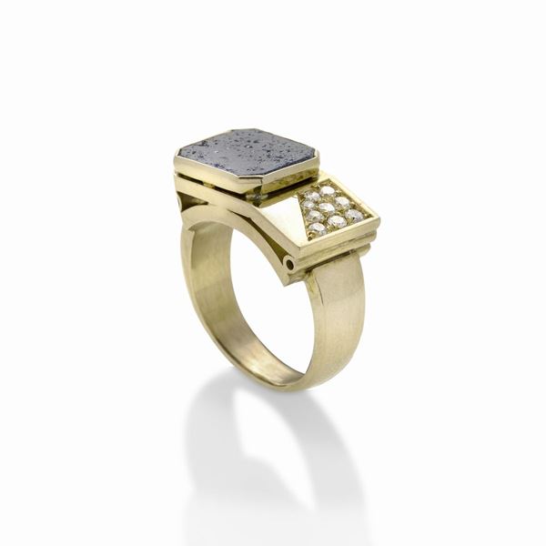 MATERIALE: oro giallo, diamanti e lapislazzulo DESCRIZIONE: anello a ponte realizzato con lapislazzulo di taglio ottagonale e pavè di diamanti su un lato, reca il marchio 750 MISURE: anello 12 PESO: gr 10.0