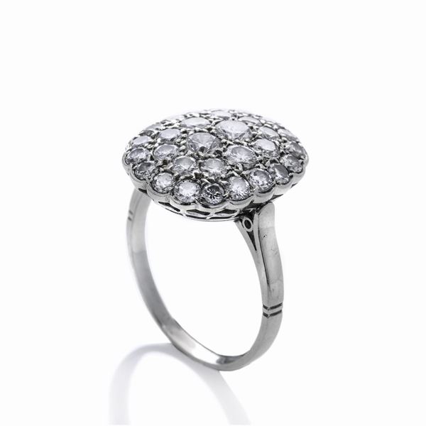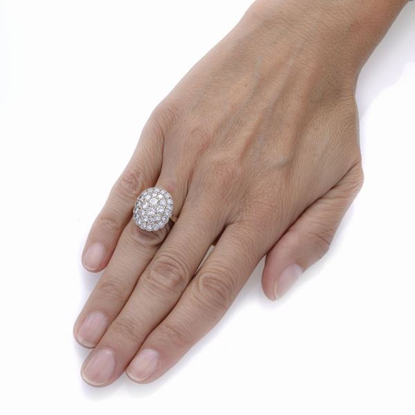 MATERIALE: oro bianco e diamanti DESCRIZIONE: anello a scudo, di forma ovale, interamente impreziosito con pavè di diamanti taglio brillante, reca il marchio 750 MISURE: anello 21 PESO: diamanti ct 2.20, colore H, purezza SI, gr 6.2