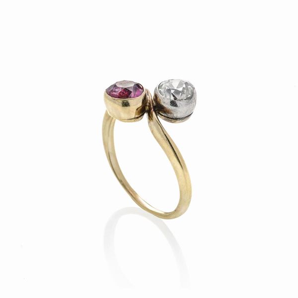 MATERIALE: oro a basso titolo, argento, diamante e rubino DESCRIZIONE: anello contrariè realizzato con diamante taglio vecchio e rubino di taglio rotondo MISURE: anello 14 PESO: gr 3.6