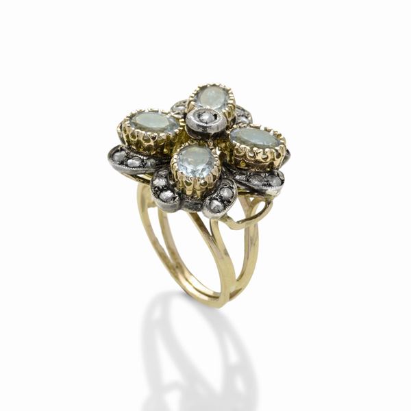MATERIALE: oro 14 kt, acquamarina e diamanti DESCRIZIONE: anello realizzato come un fiore, interamente impreziosito da rose di diamante e acquamarine, reca il marchio 14kt MISURE: anello 15 PESO: gr 9.9