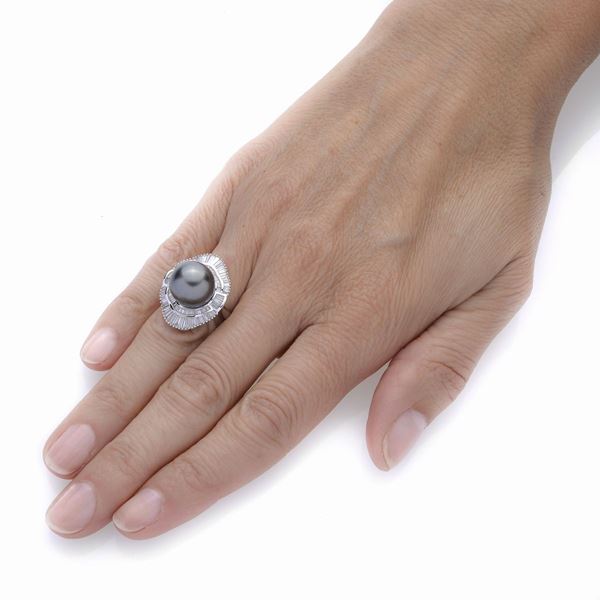 MATERIALE: oro bianco, diamanti e perla Tahiti DESCRIZIONE: anello realizzato con perla Tahiti incorniciata con diamanti taglio baguette disposti su due fasce leggermente mosse, reca il marchio 750 MISURE: anello 13 PESO: perla mm 12, diamanti ct 5.0, colore H, purezza VS, gr 9.8