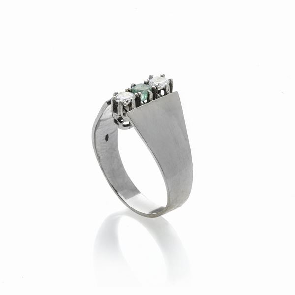 MATERIALI: oro bianco, diamanti e smeraldo DESCRIZIONE: alto anello a ponte impreziosito da uno smeraldo e due diamanti taglio brillante, reca il machio 750 MISURE: anello 17.5 PESO: smeraldo ct 0.20, diamanti ct 0.30, colore H, purezza VS, gr 5.7