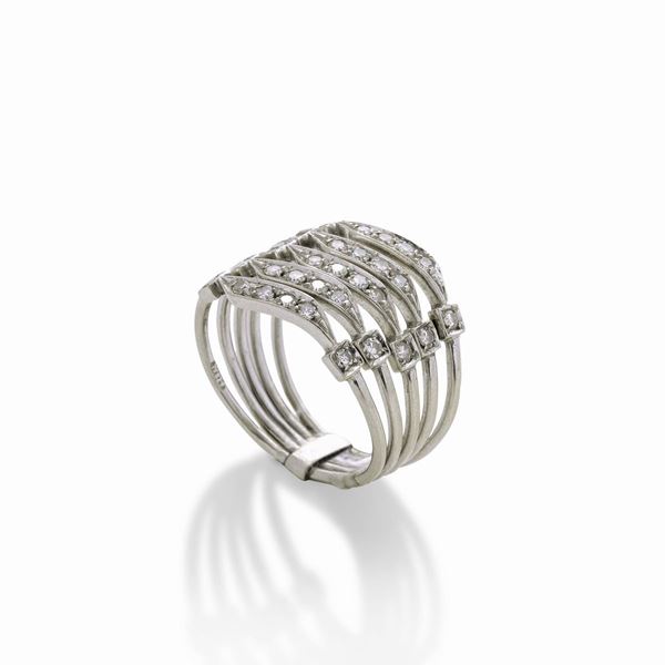 MAERIALE: oro bianco e diamanti DESCRIZIONE: anello realizzato come cinque fedi, ciascuna impreziosita con piccoli diamanti taglio huit huit, reca il marchio 750 MISURE: anello 15.5 PESO: gr 5.6