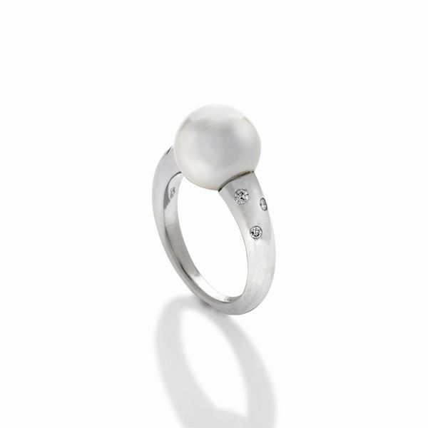 MATERIALE: oro bianco, perla Mikimoto e diamanti DESCRIZIONE: anello realizzato con perla al centro su base leggermente bombata, impreziosita da tre piccoli brillanti su ciascun lato, reca il marchio 750, corredato di scatola originale MISURE: anello 14.5 PESO: diametro perla mm 9x 8,5, corredato di certificato di garanzia n° 767703, gr 8.6