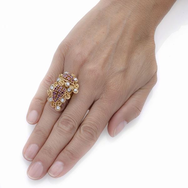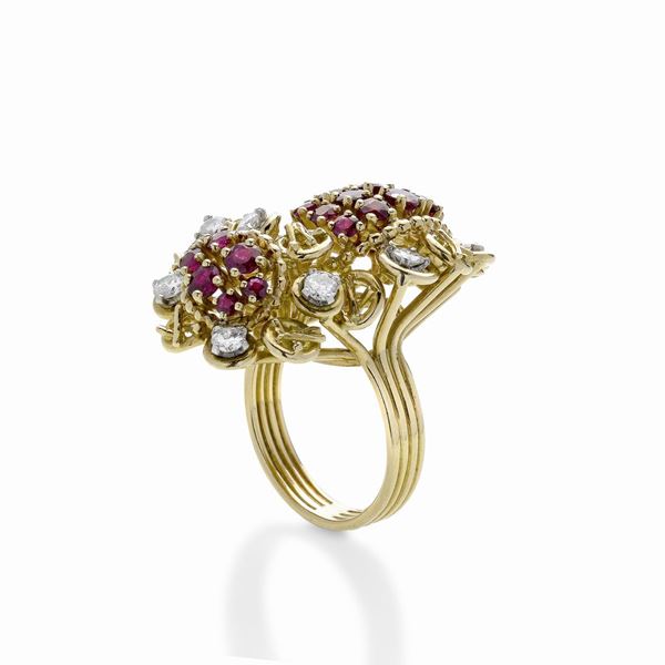 Anello in oro giallo, oro bianco, diamanti e rubini