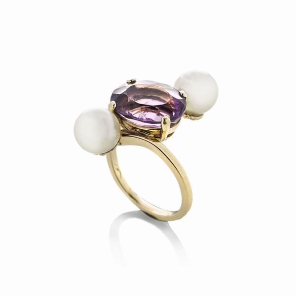 MATERIALE: oro giallo, perle coltivate e ametista DESCRIZIONE: anello a losanga realizzato con ametista taglio ovale tra due perle coltivate MISURE: anello 17 PESO: ametista ct 5.0, perle mm 8, gr 7.5