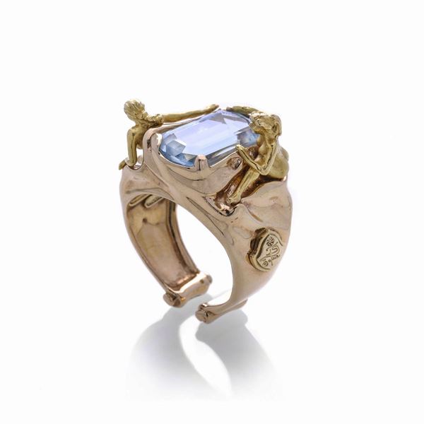 MATERIALE: oro giallo e pietra azzurra DESCRIZIONE: grande anello scultura realizzato con pietra azzurra di taglio smeraldo incorniciata da due figure femminili realisticamente modellate in pose diverse, reca il marchio 750 e una firma di difficile lettura MISURE: anello 15 PESO: gr 17.5