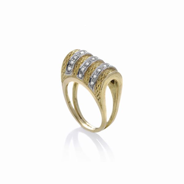 MATERIALE: oro giallo, oro bianco e diamanti DESCRIZIONE: anello scultura realizzato in oro inciso con motivo a rete alternato a tre file di diamanti taglio brillante MISURE: anello 14 PESO: gr 9.7