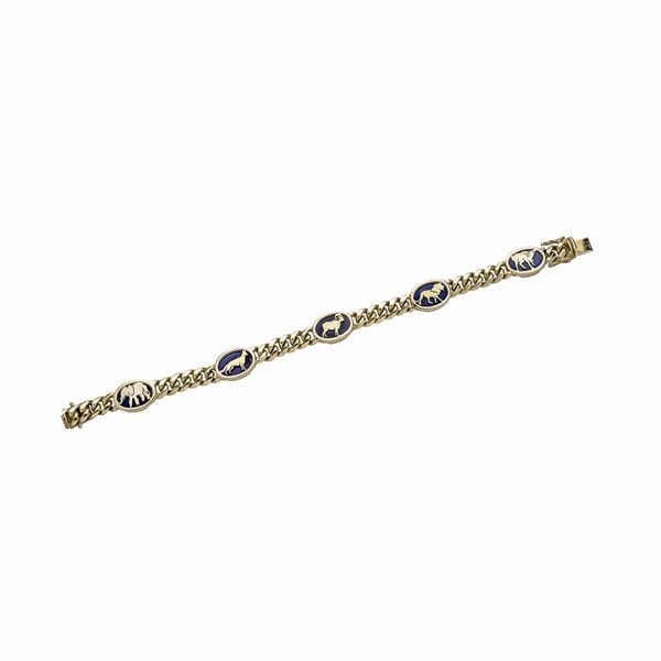 MATERIALE: oro giallo 14 kt e pietra blu DESCRIZIONE: bracciale realizzato con maglie intrecciate alternate a placchette ovali, ciascuna con pietra blu e segno zodiacale, reca il marchio 585 MISURE: aperto cm 19.3 PESO: gr 29.2
