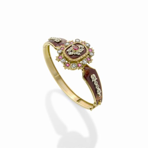 Bracciale rigido in oro giallo, smalto rosso, diamanti e rubini