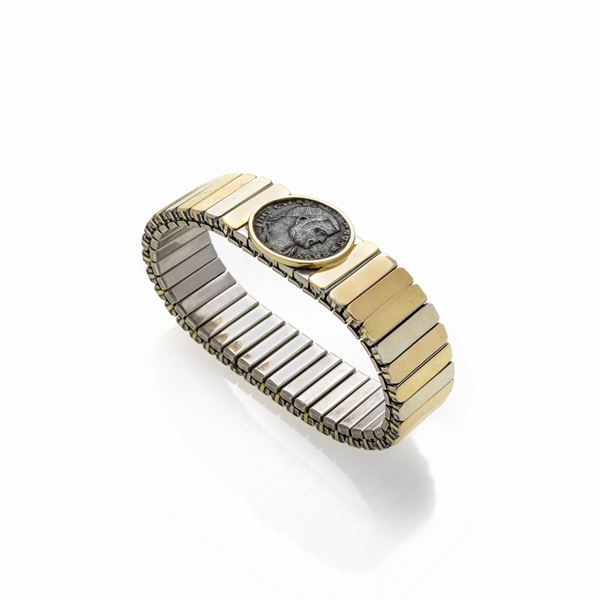 Bracciale semirigido in acciaio, oro giallo, oro rosa , oro bianco e moneta antica