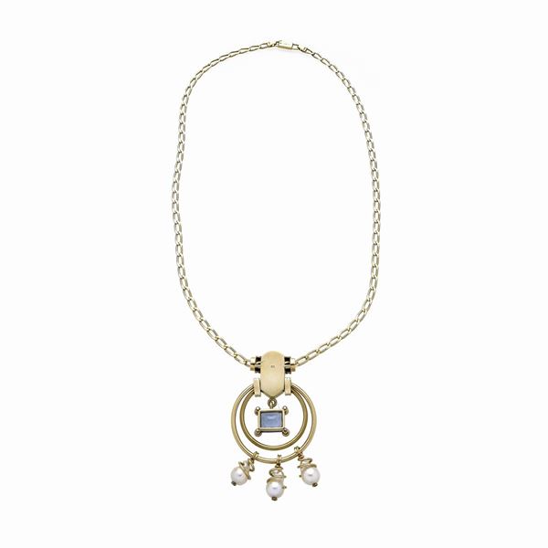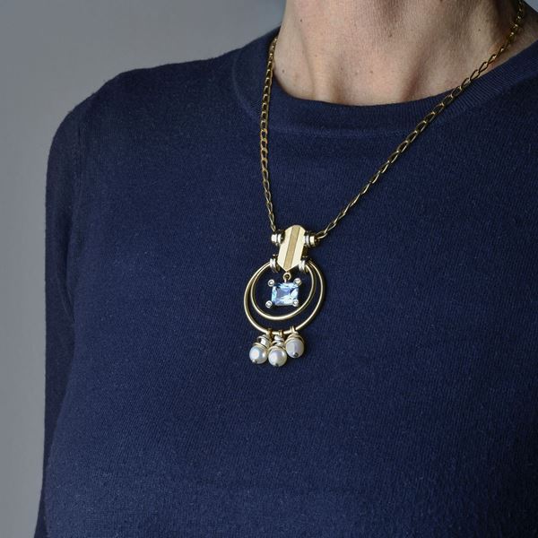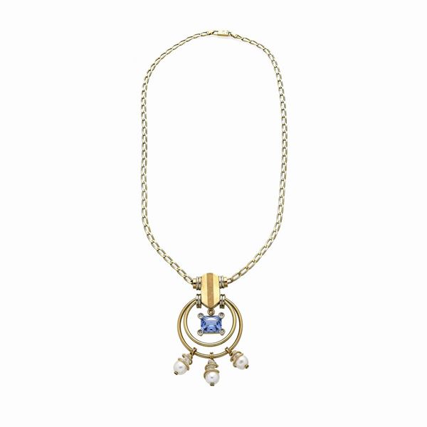 Catena e pendente in oro giallo, diamanti, perle e pietra azzurra