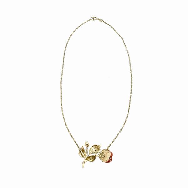 MATERIALE: oro giallo e corallo rosa DESCRIZIONE: collana realizzata con catena a maglie intrecciate in oro giallo e parte centrale, realisticamente modellata come una rosa, in corallo rosa scolpito e foglie in oro satinato, reca il marchio 750 MISURE: catena aperta cm 42, pendente cm 4.0x 3.4h PESO: gr 14.1