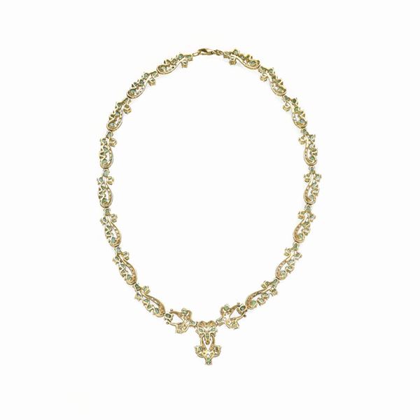 MATERIALE: oro giallo, diamanti e smeraldi DESCRIZIONE: collier, di ispirazione floreale, realizzato come volute contrapposte, ciascuna voluta impreziosita con diamanti taglio brillante e smeraldi di taglio ovale MISURE: collier aperto cm 45 PESO: gr 59.4