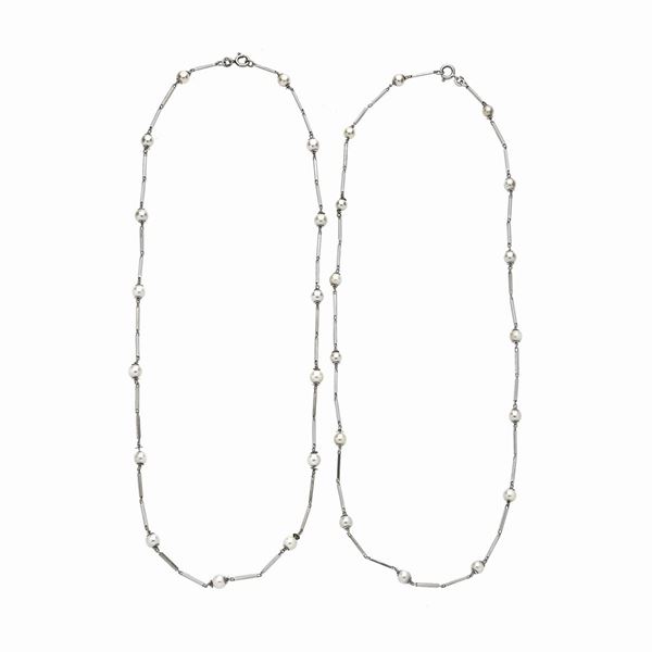MATERIALE: oro bianco e perle DESCRIZIONE: due collane realizzate con maglie rettangolari in oro bianco alternate a perle, firmata UnoAerre, recano il marchio 750 MISURE: ciascuna aperta cm 49.2 PESO: gr 21.6 complessivi