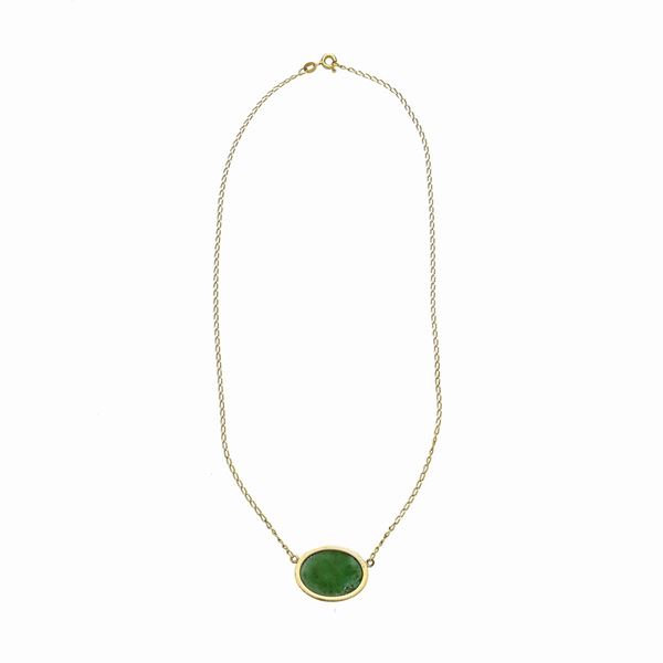 MATERIALE: oro giallo e pasta di turchese DESCRIZIONE: girocollo realizzato con catena a maglie intrecciate in oro e centrato da pasta di turchese taglio cabochon ovale, reca il marchio 750 MISURE: aperto 38.5x 1.7h PESO: gr 6.3