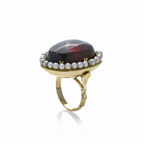 MATERIALE: oro giallo, perle e ambra DESCRIZIONE: grande anello realizzato con ambra taglio cabochon ovale, incorniciata con perle, reca un marchio di difficile lettura MISURE: anello 17 PESO: gr 16.2