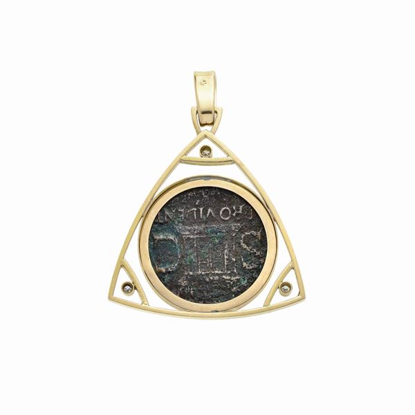 MATERIALE: oro giallo, diamanti e moneta DESCRIZIONE: grande pendente di forma triangolare con moneta al centro, incorniciata da tre piccoli diamanti taglio brillante, reca il marchio 750 MISURE: cm 4.3x 5.7 PESO: gr 23.4