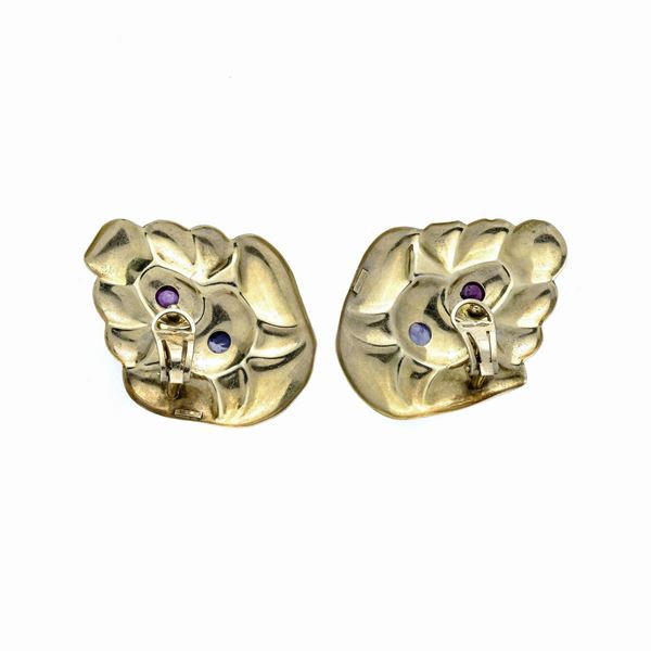 MATERIALE: oro giallo, zaffiri e rubini DESCRIZIONE: grandi orecchini a clips, ciascuno realizzato come una foglia stilizzata impreziosita con uno zaffiro taglio cabochon e un rubino sempre taglio cabochon, recano il marchio 750 MISURE: 3.6x 4.6h PESO: gr 12.6