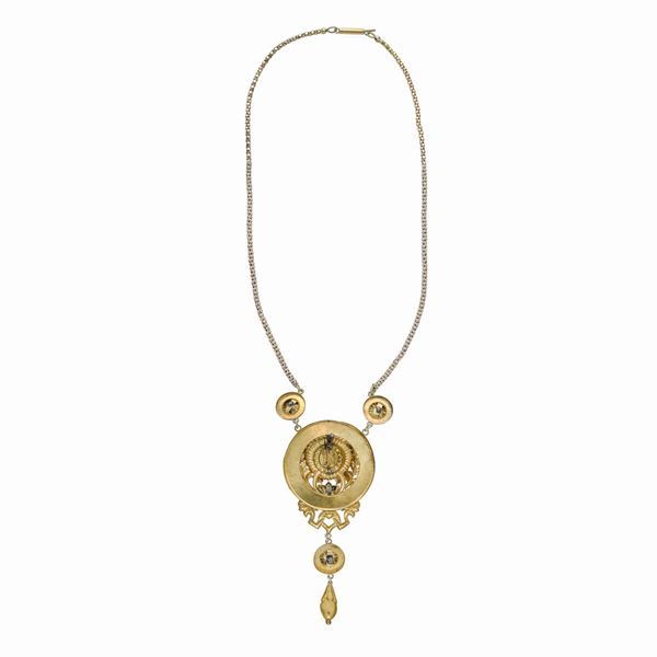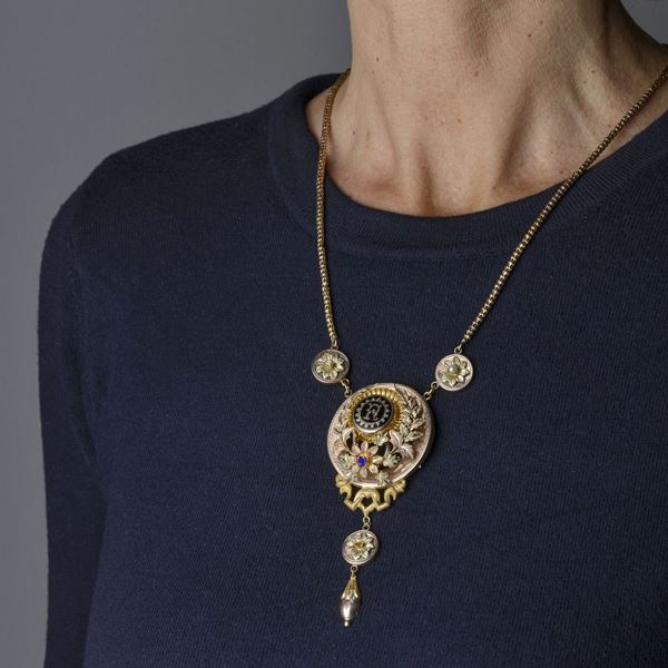 MATERIALE: oro a basso titolo, oro rosa, microperle e smalto nero DESCRIZIONE: lunga collana realizzata con maglia tubolare baccellata e grande pendente al centro, di forma circolare, eseguito con cartiglio con la lettere R in smalto nero e oro e ghirlanda di foglie MISURE: collana aperta cm 51, pendente cm 7.0x 9.0h PESO: gr 17.2