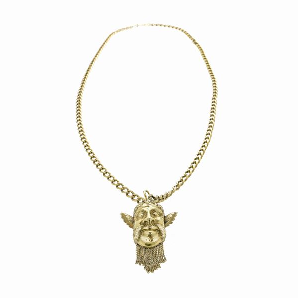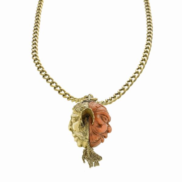 MATERIALE: oro giallo e corallo rosso DESCRIZIONE: lunga collana realizzata con maglie incise e intrecciate tra loro con un pendente modellato come una testa di Bacco, bifronte, con una parte in corallo inciso ed un'altra in oro, frange pendenti, reca il marchio 750 MISURE: collana aperta cm 75.5, pendente cm 4.0x 6.0 PESO: gr 52.2