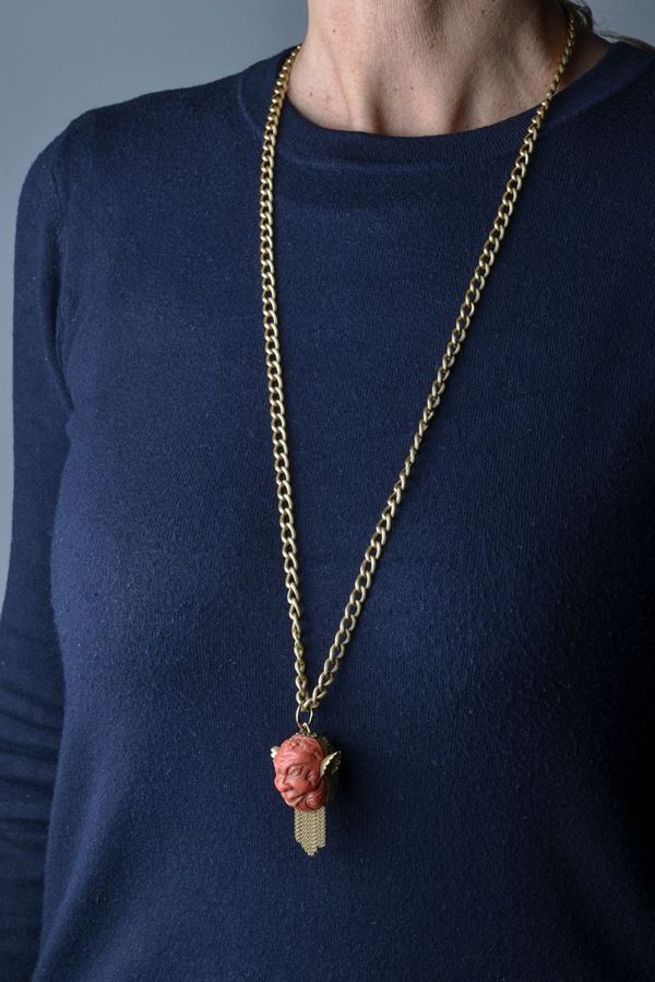 Lunga collana in oro giallo con pendente Bacco in corallo e oro giallo