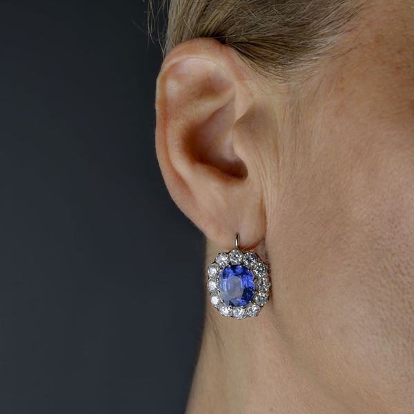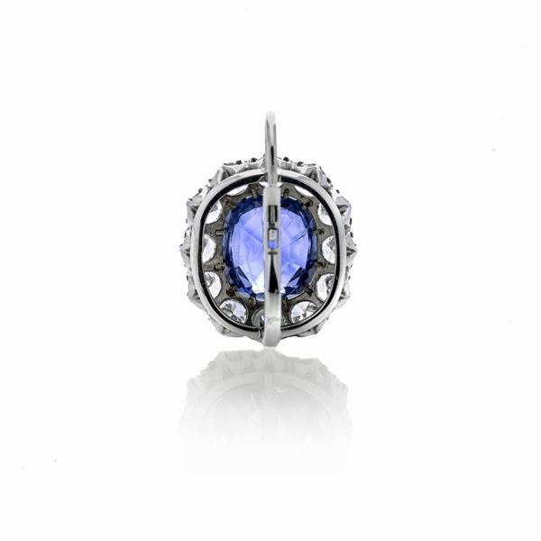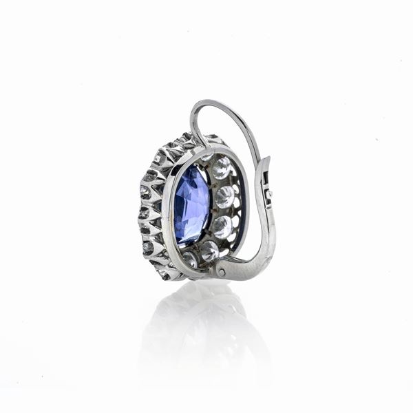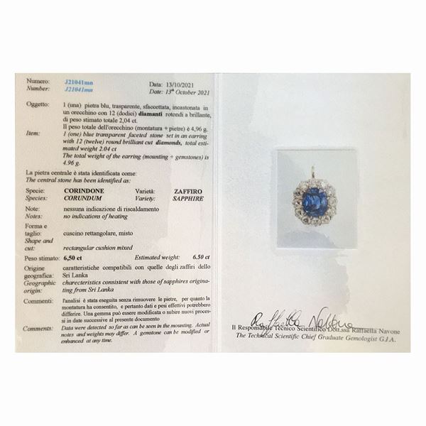 MATERIALE: oro bianco, diamanti e zaffiro Ceylon naturale non trattato DESCRIZIONE: orecchino realizzato con zaffiro taglio cuscino rettangolare misto incorniciato con diamanti taglio brillante zaffiro MISURE. cm 1.8x2.3 h PESO: zaffiro ct 6.50, diamanti ct 2.04, colore G-H, purezza VS (uno di purezza SI), corredato di certificato RAG, numero J21041MN, del 13.10.2021, gr 4.9