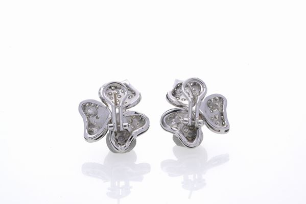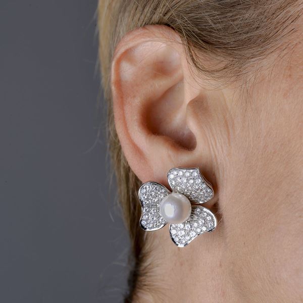 MATERIALE: oro bianco, diamanti e perle coltivate DESCRIZIONE: paio di orecchini, di ispirazione floreale, ciascuno realizzato come un fiore con perla e grandi petali lobati con pavè di diamanti, recano il marchio 750 MISURE: diametro cm 2.8 PESO: perle mm 9, diamanti ct 4.50, colore G, purezza VVS-VS, gr 15.9