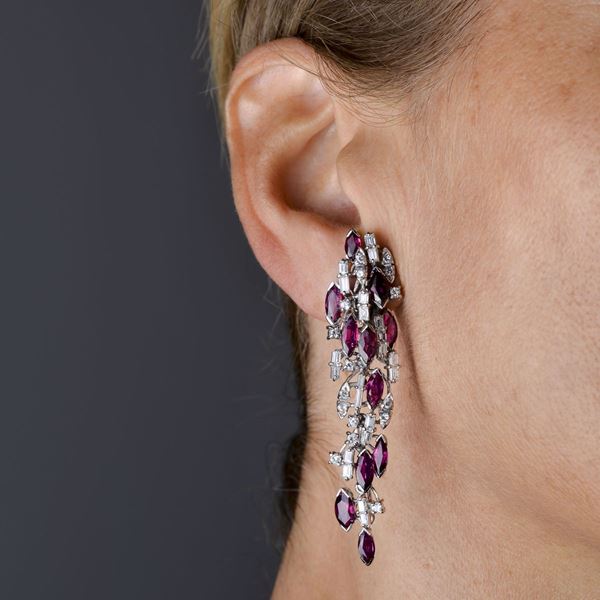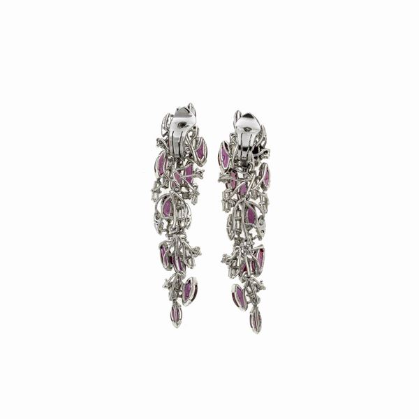 MATERIALE: oro bianco, diamanti e rubini DESCRIZIONE: paio di lunghi orecchini pendenti, ciascuno realizzato a "cascata", interamente impreziosito con rubini taglio navette e diamanti taglio brillante e baguette, en tremblant, recano inciso il numero 01778 MISURE: cm 1.5x 6.5h PESO:rubini ct 8.0, diamanti ct 1.40, colore H/I, purezza SI, gr 17.4