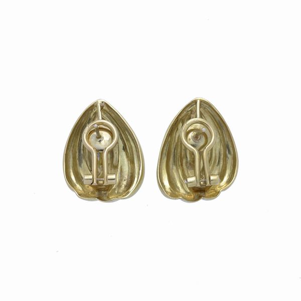 MATERIALE: oro giallo, oro bianco e diamanti DESCRIZIONE: paio di orecchini, ciascuno realizzato come una foglia baccellata, impreziosito con piccoli diamanti taglio brillante, recano il marchio 750 MISURE: cm 1.8x 2.5h PESO: gr 11.7