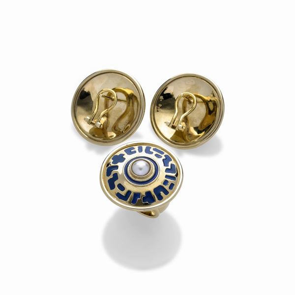 MATERIALE: oro 14kt, perle e smalto blu DESCRIZIONE: parure composta da paio di orecchini realizzati come un disco, con perla coltivata al centro incorniciata con motivi geometrici in smalto blu e grande anello en suite, recano il marchio 14kt MISURE: orecchini diametro mm 29 e anello 11 PESO: gr 38.6 complessivi