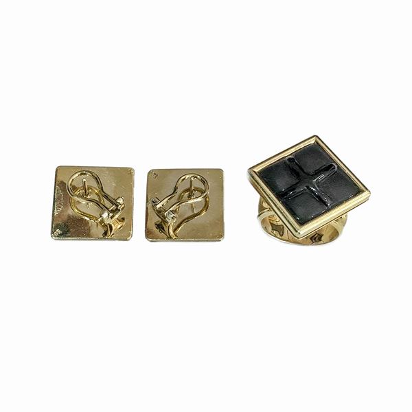 MATERIALE: oro 14 kt e pietra nera DESCRIZIONE: parure composta da paio di orecchini di forma quadrata, ciascuno realizzato con pietra nera leggermente bombata con X stilizzata a rilievo, e anello en suite, recano il marchio 14kt MISURE: anello 10.5, orecchini cm 1.7x 1.7h PESO: gr 27.5 complessivi