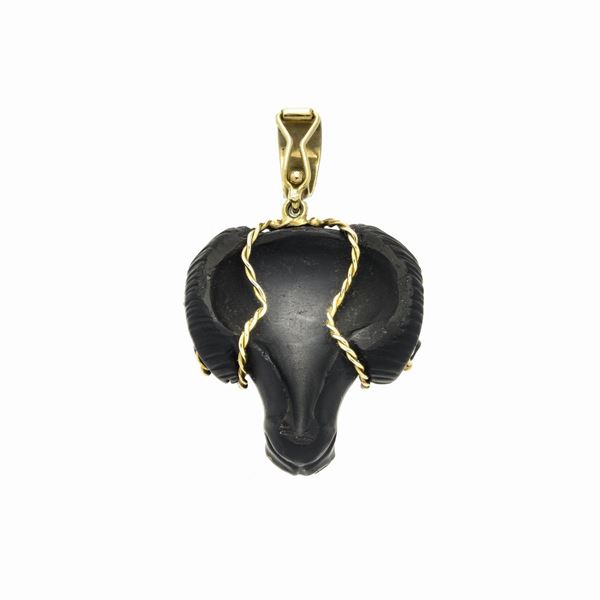 MATERIALE: resina nera e oro giallo DESCRIZIONE: pendente realisticamente modellato come un ariete con occhi in diamanti e montatura in oro giallo eseguita a torchon MISURE: cm 2.6x 4.0h PESO: gr 13.1