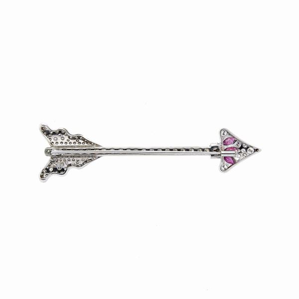 Spilla freccia in oro bianco, diamanti e rubini