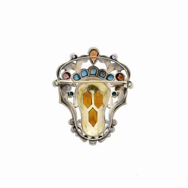 Spilla in oro bianco, smalto blu, turchese, granato, quarzo arancione, zaffiri e smeraldi