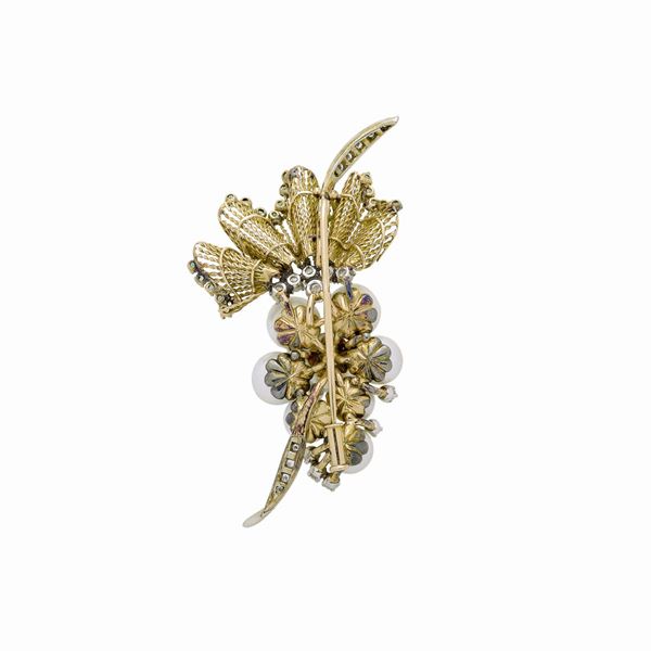 Spilla in oro giallo, oro bianco, smeraldo, diamanti e perle