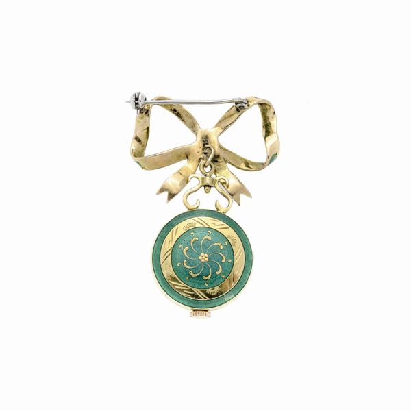 MATERIALE: oro giallo e smalto verde DESCRZIONE: spilla realizzata come un fiocco decorato con smalto verde che sorregge un piccolo orologio da tasca, con ghiera in smalto verde, quadrante avorio, indici applicati in oro, lancette a bastone sempre in oro, movimento a carica manuale, cassa posteriore in smalto verde con fiore stilizzato in oro giallo MISURE: cm 3.3x 5.0h, diametro quadrante mm 20 PESO: gr 13.5 complessivi