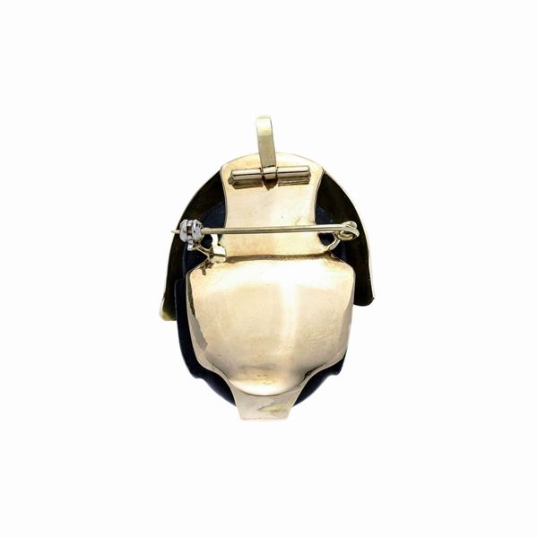 Spilla pendente 'maschera orientale' in oro giallo e pietra nera