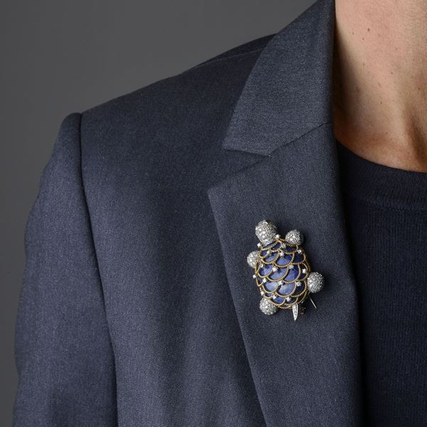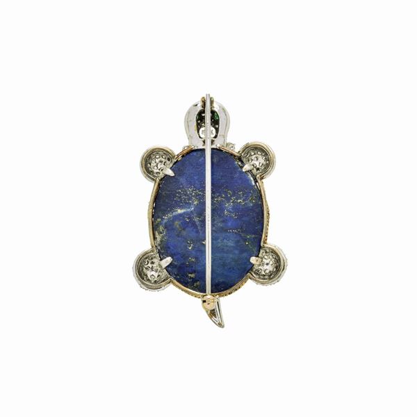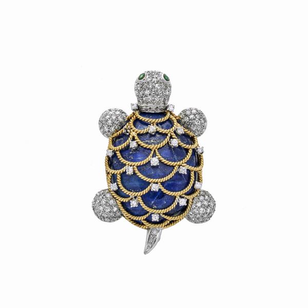 MATERIALE: oro giallo, oro bianco, lapislazzulo, diamanti e smeraldi DESCRIZIONE: spilla realisticamente modellata come una tartaruga, occhi con smeraldi, testa, zampe e coda con pavè di diamanti, corpo in lapislazzulo impreziosito con maglia a cordonetto disposta a "squama di pesce" con diamanti, reca il marchio 18 kt MISURE: cm 3.5x 5.0h PESO: diamanti ct 1.20, colore H, purezza SI, gr 21.3