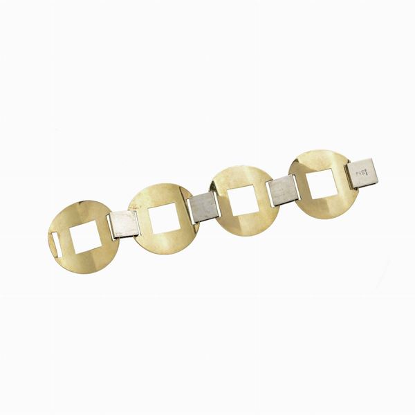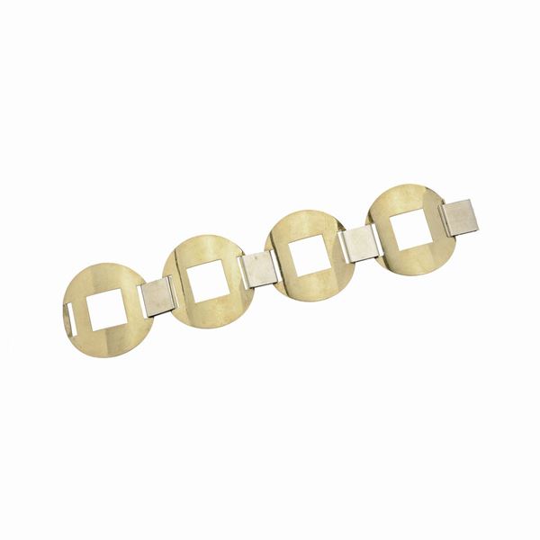 MATERIALE: oro giallo e oro bianco DESCRIZIONE: alto bracciale realizzato con grandi maglie circolari leggermente bombate alternate a maglie quadrate, firmato UnoaErre, reca il marchio 750 MISURE: aperto cm 19 PESO: gr 77.1