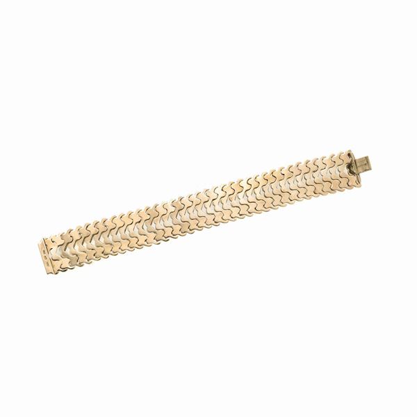 MATERIALE: oro rosa DESCRZIONE: alto bracciale realizzato con maglie sagomate concave e convesse intrecciate tra loro, reca il marchio 750 MISURE: aperto cm 19, h cm 2.4 PESO: gr 53.3