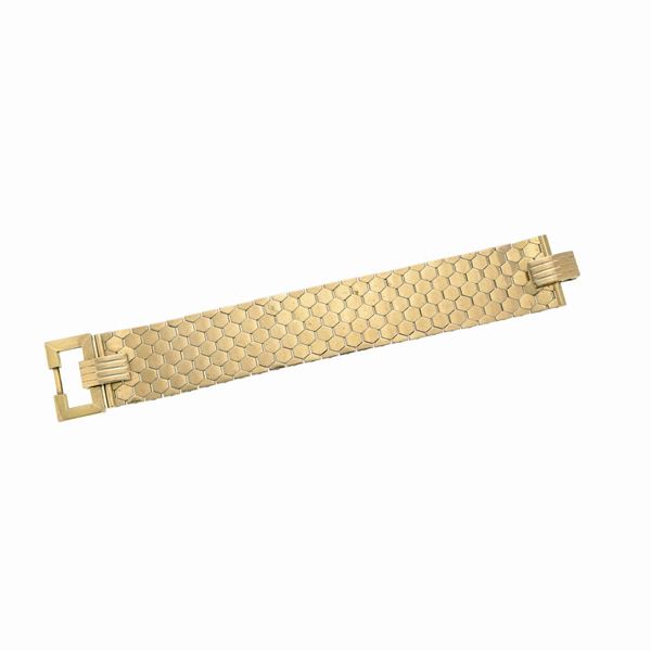 MATERIALE: oro giallo DESCRIZIONE: alto bracciale realizzato con maglie esagonali a formare un motivo a nido d'ape e fermezza eseguita come una fibbia rettangolare, reca il marchio 750 MISURE: aperto cm 19, h cm 2.9, PESO: gr 111.3