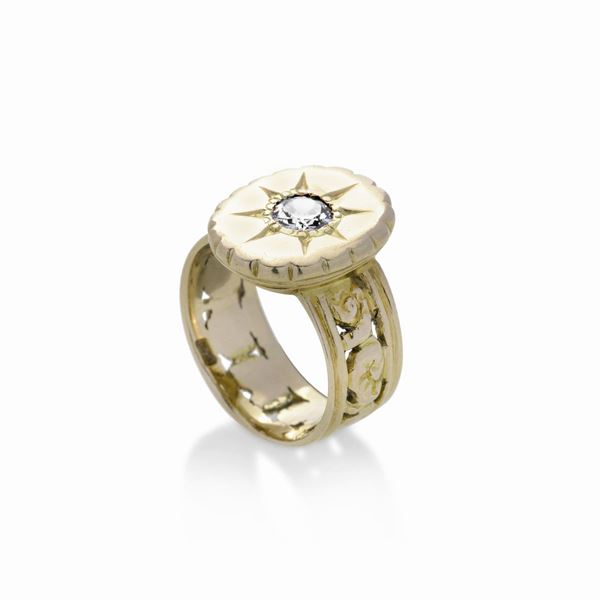 MATERIALE: oro a basso titolo e diamante DESCRIZIONE: anello a scudo realizzato con un diamante taglio vecchio montato a stella e fascia realizzata a tricot, reca un punzone di difficile lettura MISURE: anello 8.5 PESO: diamante ct 0.30 circa, gr 5.2