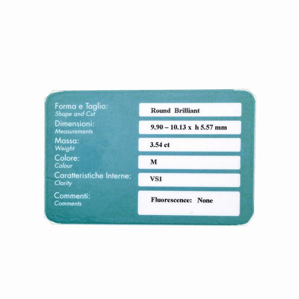 MATERIALE: oro bianco e diamante DESCRIZIONE: anello solitario con diamante taglio brillante montato con otto griffe, reca il marchio 750 MISURE. anello 13 PESO: diamante ct 3.54, colore M, purezza VS, gr 4.5 corredato di certificazione RAG, Torino