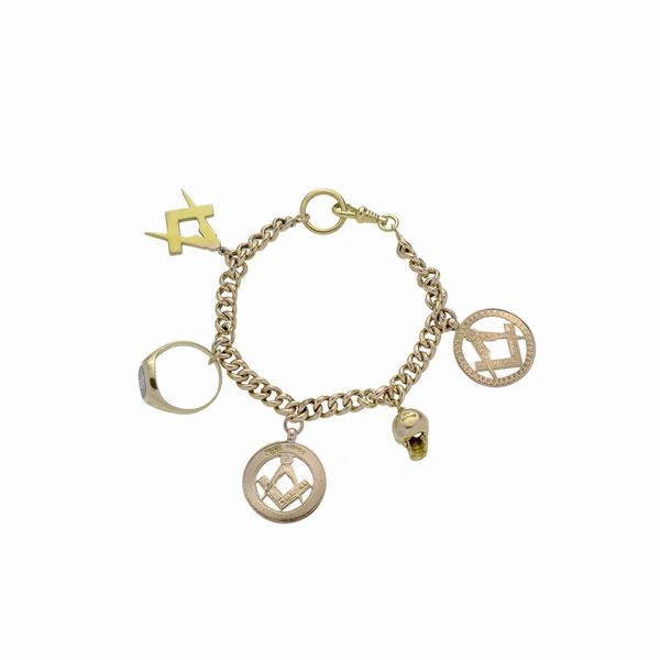 Bracciale in oro giallo, oro a basso titolo con cinque charms di ispirazione massonica