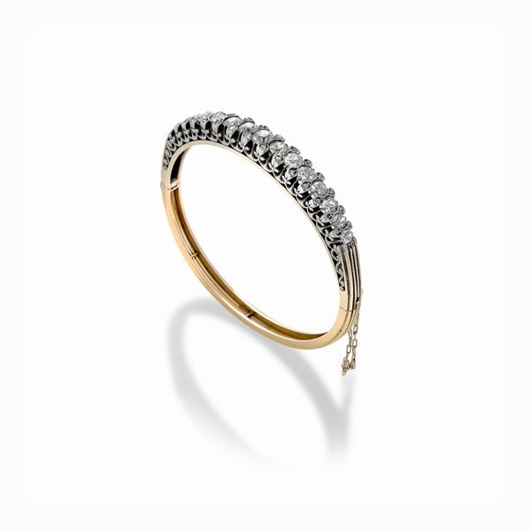 MATERIALE: oro rosa, platino e diamanti DESCRIZIONE: bracciale rigido realizzato con quattordici diamanti taglio ovale e cuscino, degradè, incorniciati con piccole rose di diamante, su alta base realizzata come un serto di foglie e fiori stilizzati, parte inferiore in oro giallo MISURE: diametro interno cm 5.5 PESO: diamanti ct 4.20 circa, colore I, purezza SI, gr 25.3