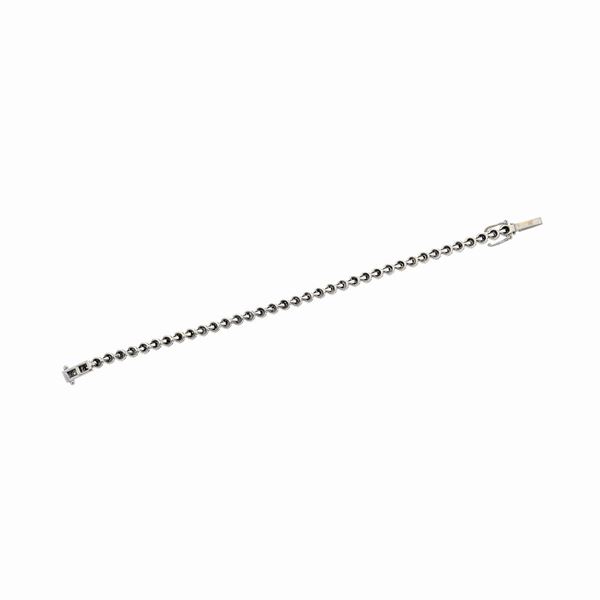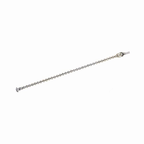 MATERIALE: oro bianco e diamanti DESCRIZIONE: Bracciale tennis realizzato con una serie di castoni rotondi ciascuno impreziosito con un piccolo diamante taglio huit huit MISURE: aperto cm 17.5 PESO: diamanti ct 0.40, gr 14.6