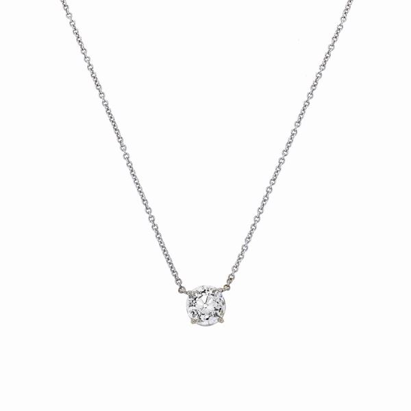 MATERIALE: oro bianco e diamante DESCRIZIONE: catena realizzate a maglie intrecciate e punto luce con diamante taglio vecchio, reca il marchio 750 MISURE: aperta cm 41 PESO: diamante ct 2.40, colore K, purezza SI, gr 2.8