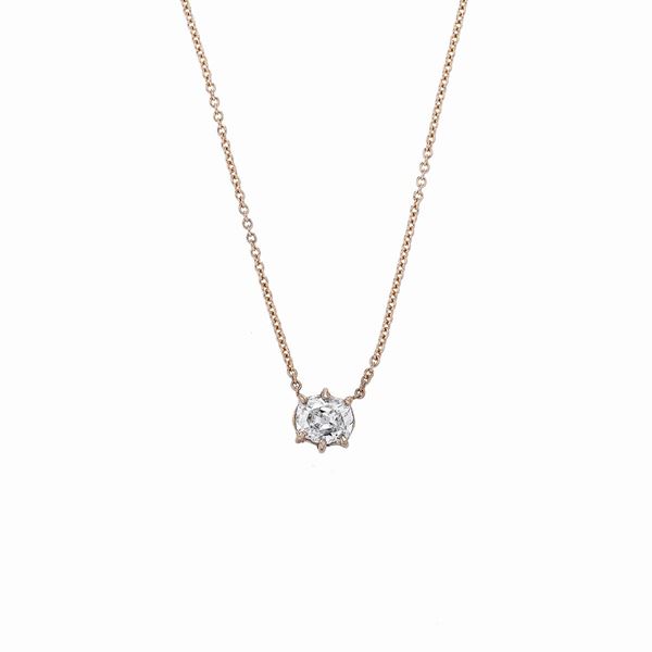 MATERIALE: oro rosa e diamante DESCRIZIONE: catena realizzate a maglie intrecciate e punto luce con diamante taglio vecchio ovale, reca il marchio 750 MISURE: aperta cm 40.5 PESO: diamante ct 0.55, colore H, purezza SI, gr 2.6