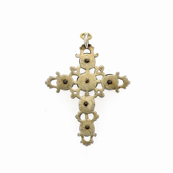 MATERIALE: oro a basso titolo, argento e granati DESCRIZIONE: Pendente a croce realizzato a volute in oro traforato impreziosite da granati ovali mointati entro castoni a notte, la parte posteriore in oro liscio, corredato di astuccio da viaggio a forma di tabernacolo in pelle bulinata MISURE: cm 3,7x5 PESO: g 10,2